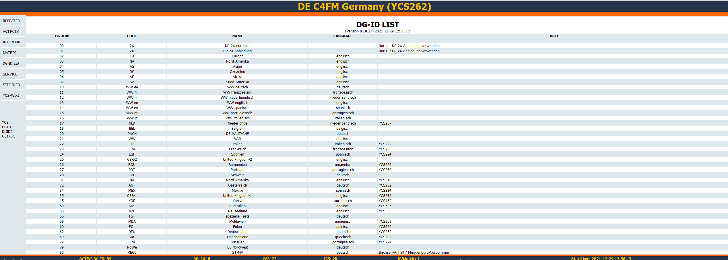 This page shows the DG-IDs available on the YCS server in a tabular list.