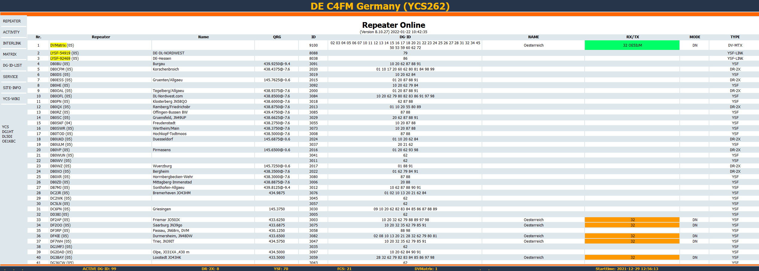 | Repeater | Client call sign Interlink | callsign (5) ⇒ heartbeat counter FCSXXXxx-callsign ⇒ Client using FCS-Protocol (xx = connection DG-ID) FCSXXXxx-number ⇒ IPSCLink (xx = DG-ID; number = IPSC-Identifier) LYSF-XXXXX ⇒ YSFLink (XXXXX = YSF Identifier) |